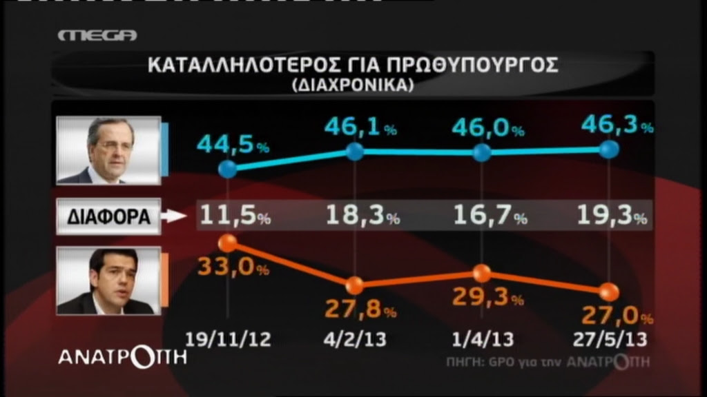Καταλληλότερος πρωθυπουργός θεωρείται ο Αντώνης Σαμαράς με ποσοστό 46,3% έναντι του Αλέξη Τσίπρα που συγκεντρώνει 27%.